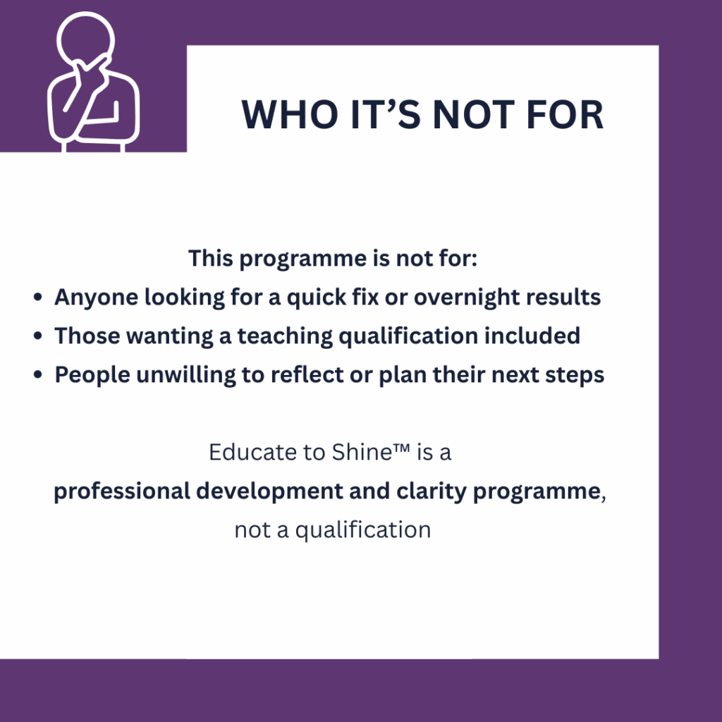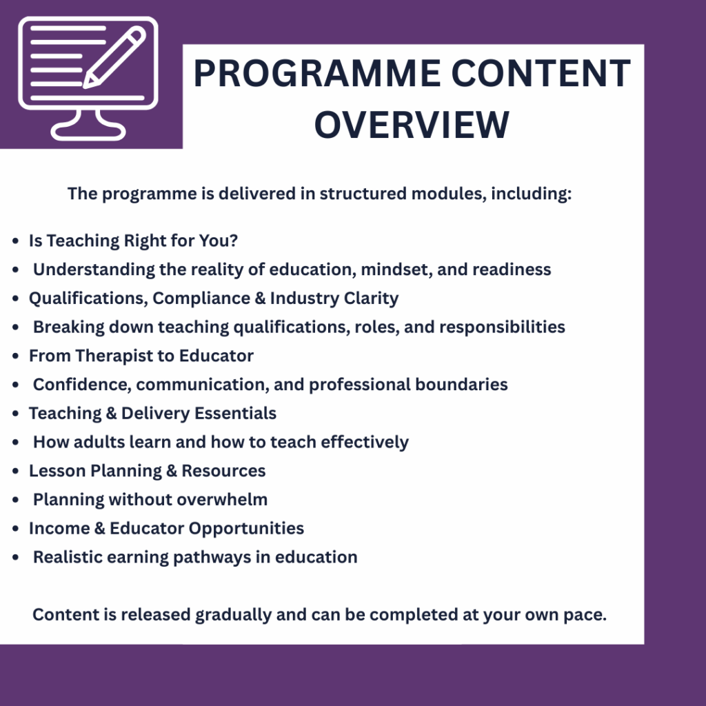This programme has been created to remove confusion, pressure, and misinformation around becoming an educator, and to provide calm, professional guidance you can trust.
